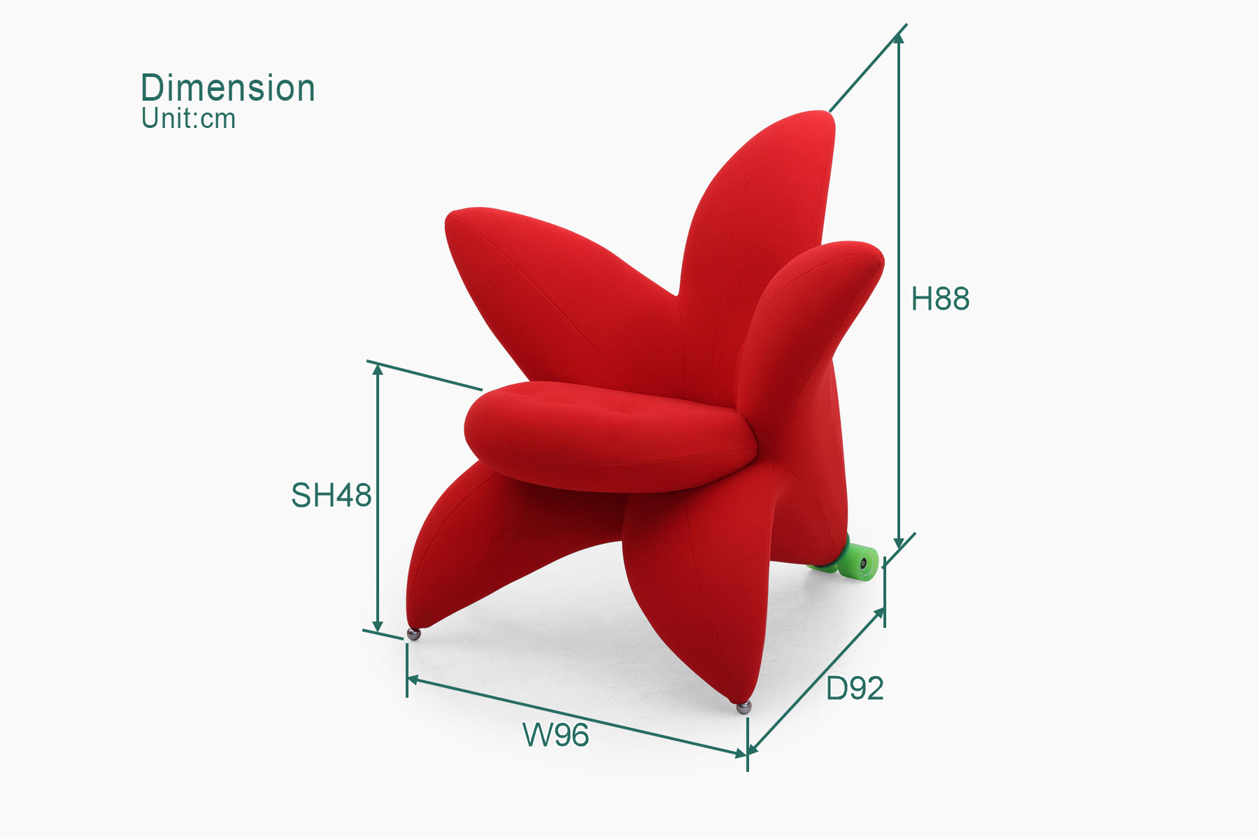 The Getsuen chair draws inspiration from the beauty of nature, taking the form of a blooming lily to bring the outdoors into interior spaces. Its petal-like structure, filled with comfortable polyurethane foam and covered in soft fabric, offers both visual delight and comfort seating experience. Supported by two sleek metal front legs and two small green wheels, this chair seamlessly blends aesthetic appeal with practicality.