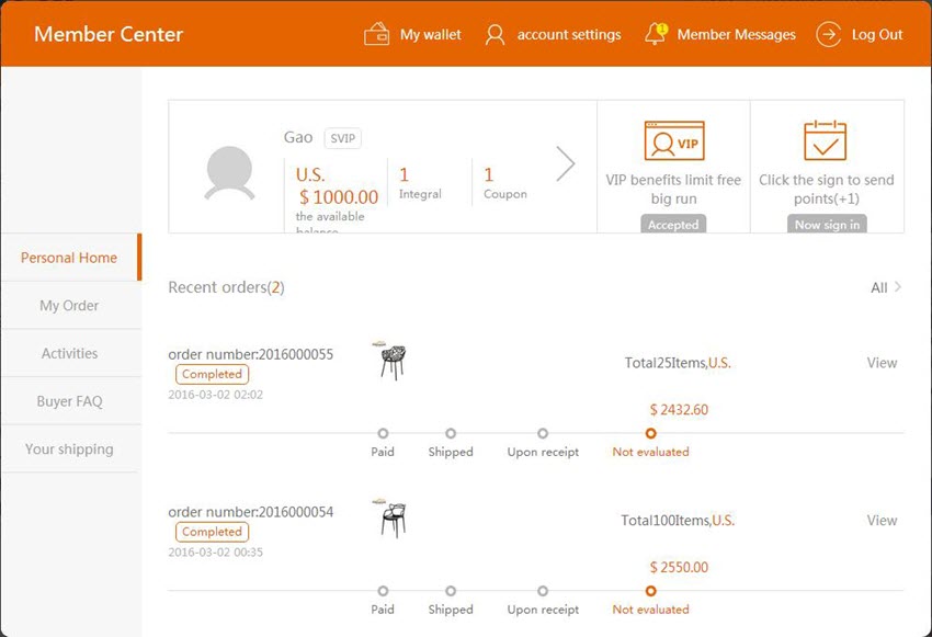 2. VIP members can login "member center", the VIP can follow and check all own shipping data, payment, shipping, consumption point , Coupons etc..